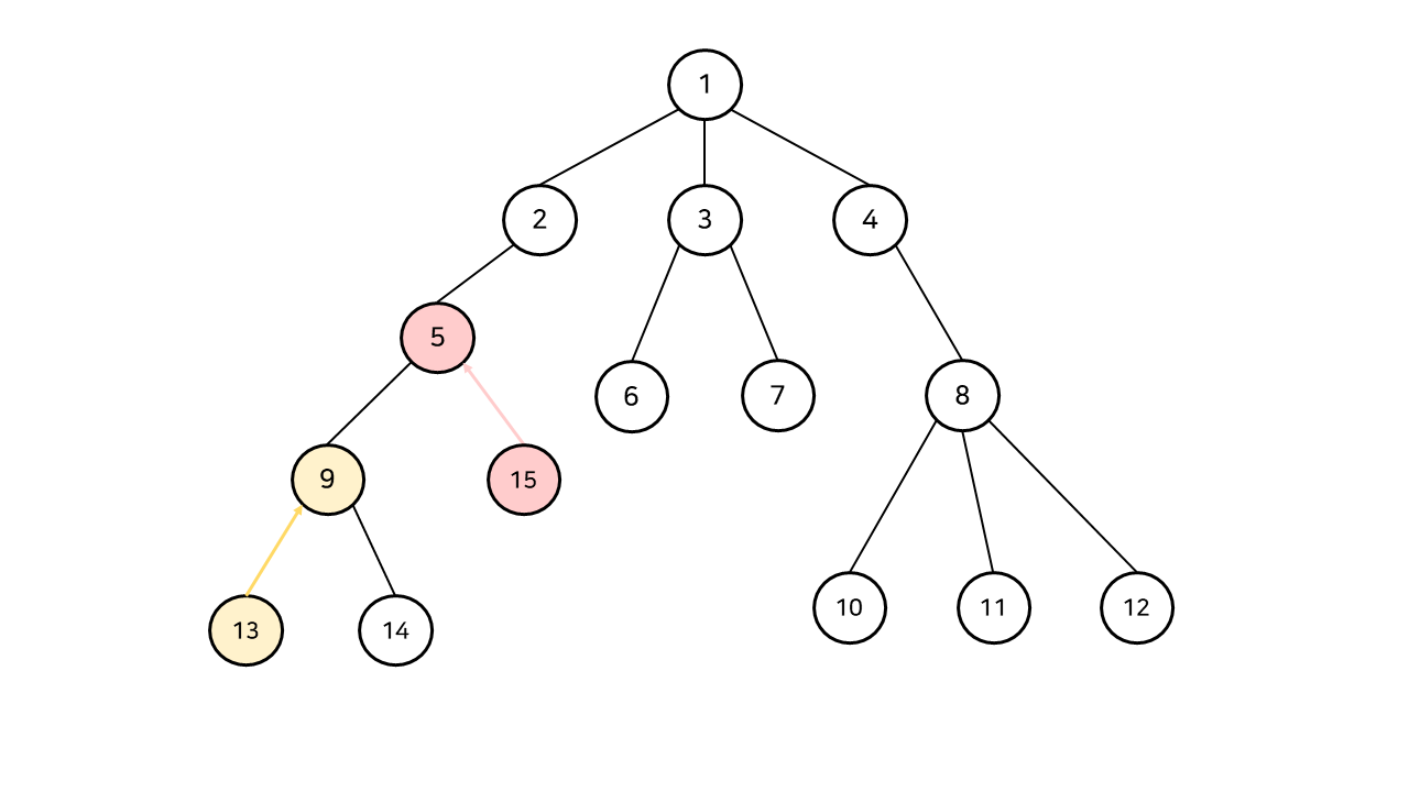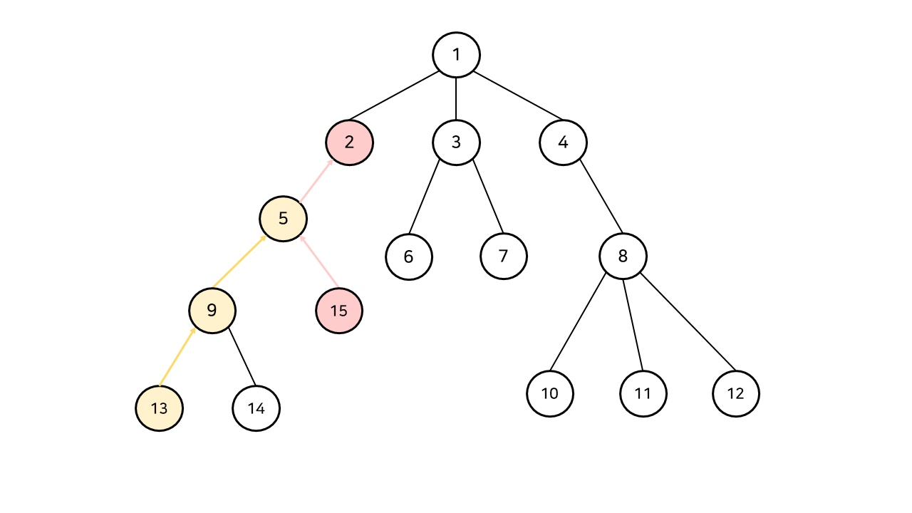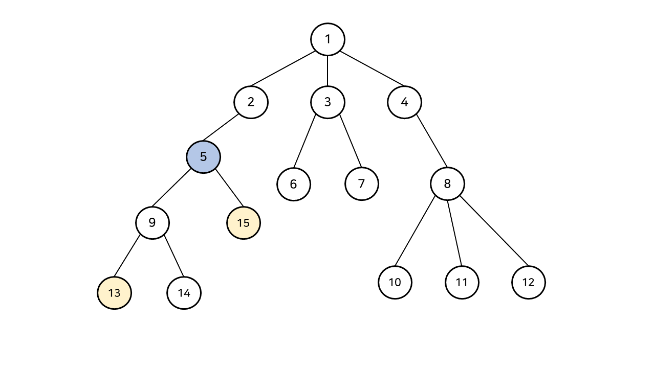 잠시 다른 예를 들어, 13번과 15번 정점의 최소 공통 조상을 구해보자. 최소 공통 조상은 5번 정점이다.