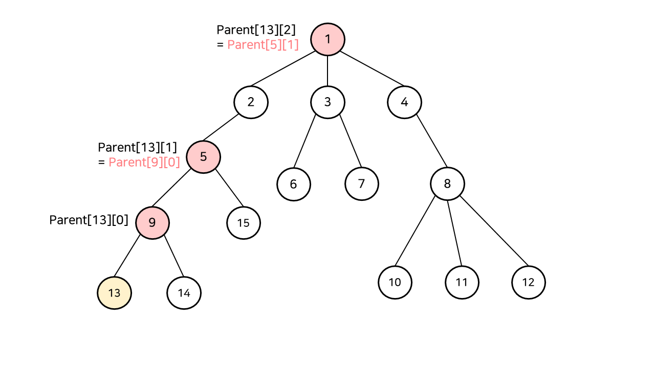 만약 13, 4번 정점의 최소 공통 조상을 구한다면, 13번 정점의 깊이를 4번 정점의 깊이로 맞추기 위해