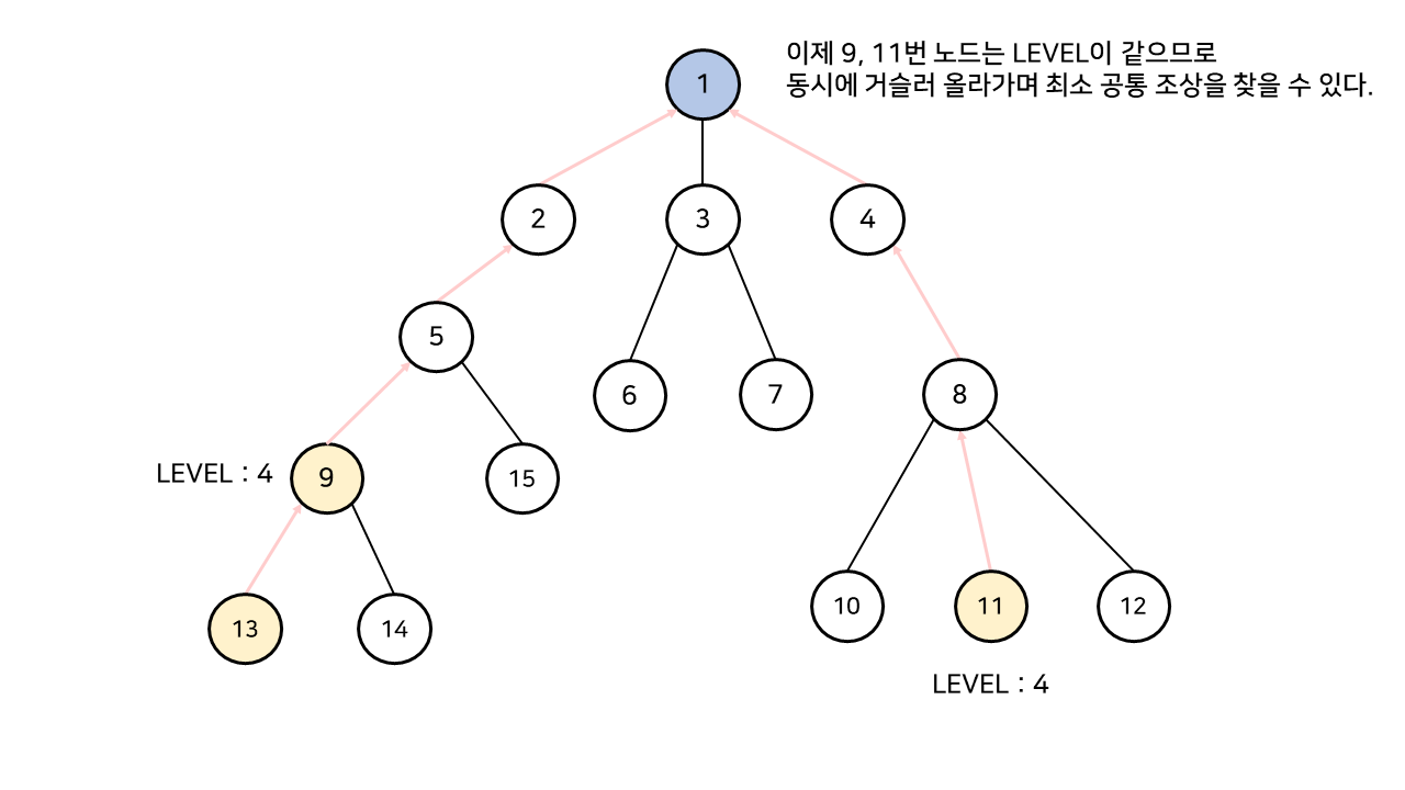 다시 원래 문제로 돌아와서, 깊이를 맞춘 후 이제는 9번, 11번 정점의 최소 공통 조상을 구하는 문제로 바뀌었다.