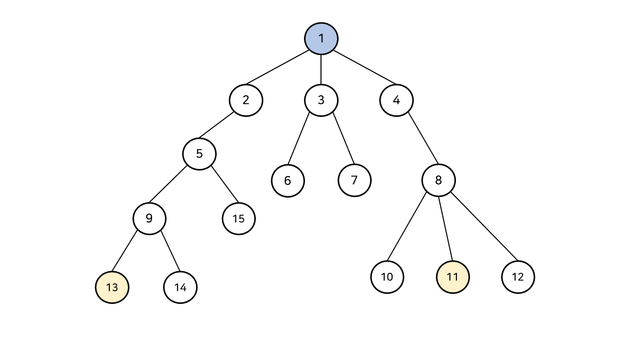 13, 11번 정점의 최소 공통 조상은 1번 정점(Root)이 된다.