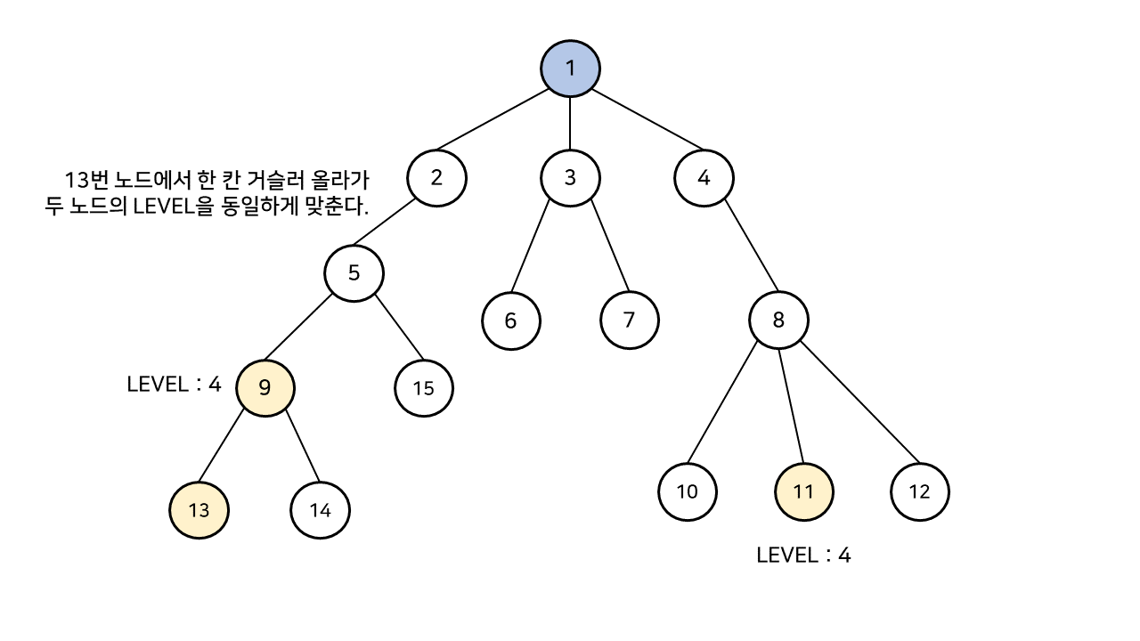 하지만 구하고자 하는 두 정점의 LEVEL(깊이)이 다르다면 문제가 발생한다.