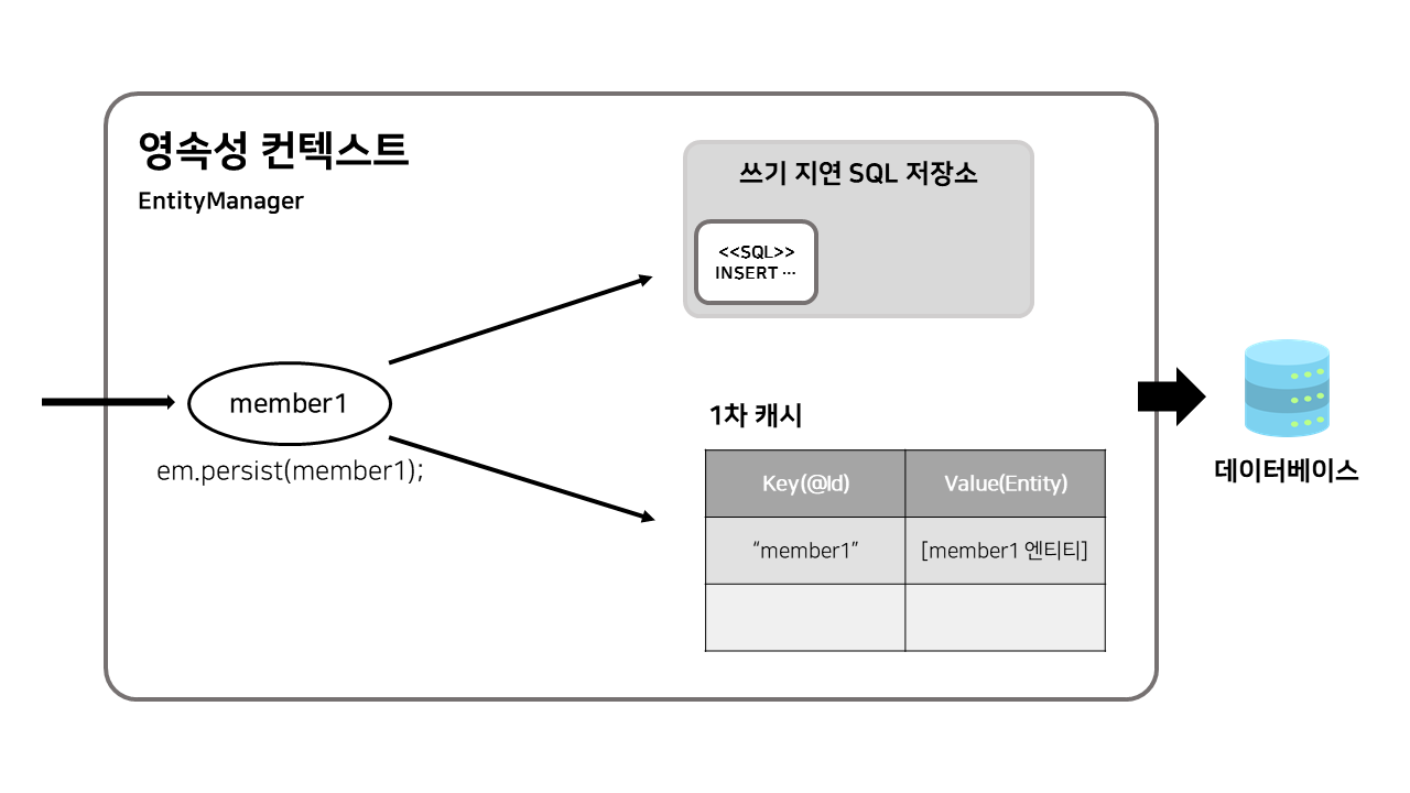 트랜잭션 내부에서 persist() 가 호출될 때, EntityManager는 해당 엔티티를 1차 캐시에 저장한 후 쓰기 지연 SQL 저장소에 INSERT 쿼리를 생성해 쌓아 놓는다.