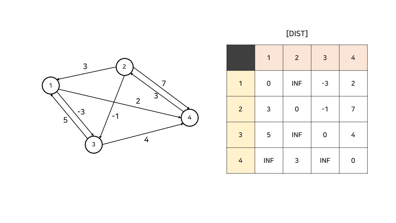 예를 들어 dist[1][4]가 1 -> 2 -> 4 경로의 가중치인 3일 때,