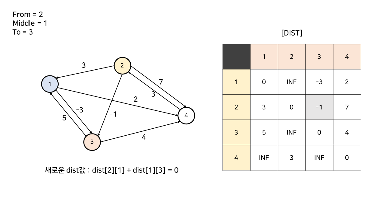 원래 2 -> 3 경로의 가중치인 -1과, 중간 노드인 1번 노드를 거쳐가는 2 -> 1 -> 3 경로의 가중치 0을 비교한다.