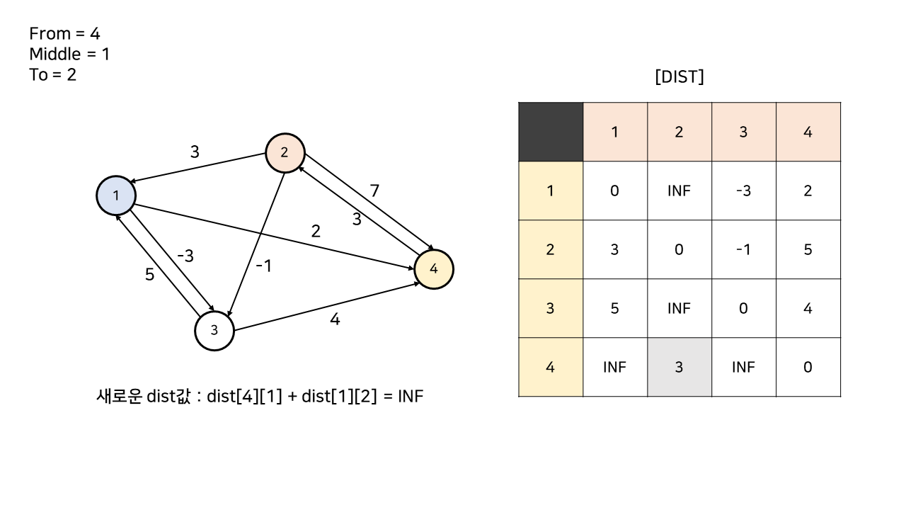 중간 노드인 1에서 2번 노드로 연결된 간선이 현재까진 없으므로, (dist[1][2] = INF)