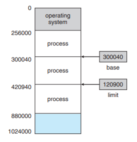 그림에서 base = 300040, limit = 120900이므로 legal 메모리 주소 범위는 300040 ~ 420940 (base + limit) 이다.