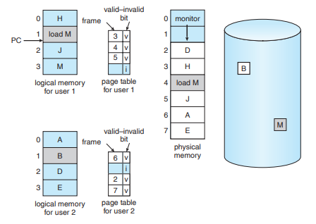 사용자 프로세스가 실행되는 동안, 페이지 결함이 발생한다. 그림에서 운영체제는 디스크에서 요구되는 페이지를 찾았지만, 그 페이지에 대해 빈 프레임을 찾으려 하니 현재 모든 프레임이 사용 중인 상태이다. 이 시점에서 운영체제에게는 몇 가지 선택지가 있다.