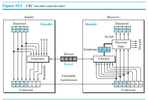 CRC는 Divisor라는 요소를 통해 구현하는데, 데이터워드를 Divisor로 나눈 나머지(Remainder)를 데이터워드에 추가해 코드워드를 생성한다. 그림은 데이터워드 1001에 대한 코드워드를 생성하는 과정이다.