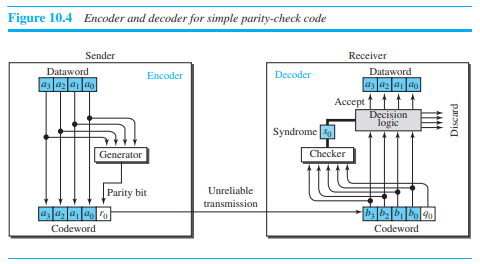 수신 측에서는 전송받은 코드워드를 복호기의 검사기(Checker)에 넣어 오류를 검출한다. 이 때 검출의 결과는 신드롬(Syndrome, s0)을 통해 나타난다. 이 신드롬 값이 0이면 오류가 발생하지 않은 것으로, 코드워드는 수락되어 데이터워드를 추출한다. 만약 신드롬 값이 1이라면 이는 손상된(유효하지 않은) 코드워드로, 폐기된다.