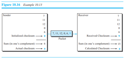 예시의 전체합 36은 이진수로 100100이고, 이 수를 4비트씩 끊어 더하여 전체합을 4비트로 나타낸다. 즉 10 + 0100 = 0110 = 6이다. 이 값에 1의 보수를 취해 Checksum으로 전송한다. 따라서 전송되는 메시지는 (7, 11, 12, 0, 6, 9)이다. (6(0110)에 대한 1의 보수는 9(1001)이다.)