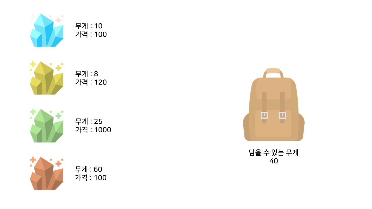 0-1 배낭 문제와는 달리, 분할 가능 배낭 문제는 주어진 보석들의 총 무게가 배낭의 수용 가능 무게 이상이라면 반드시 배낭을 꽉 채워 보석을 담을 수 있다.