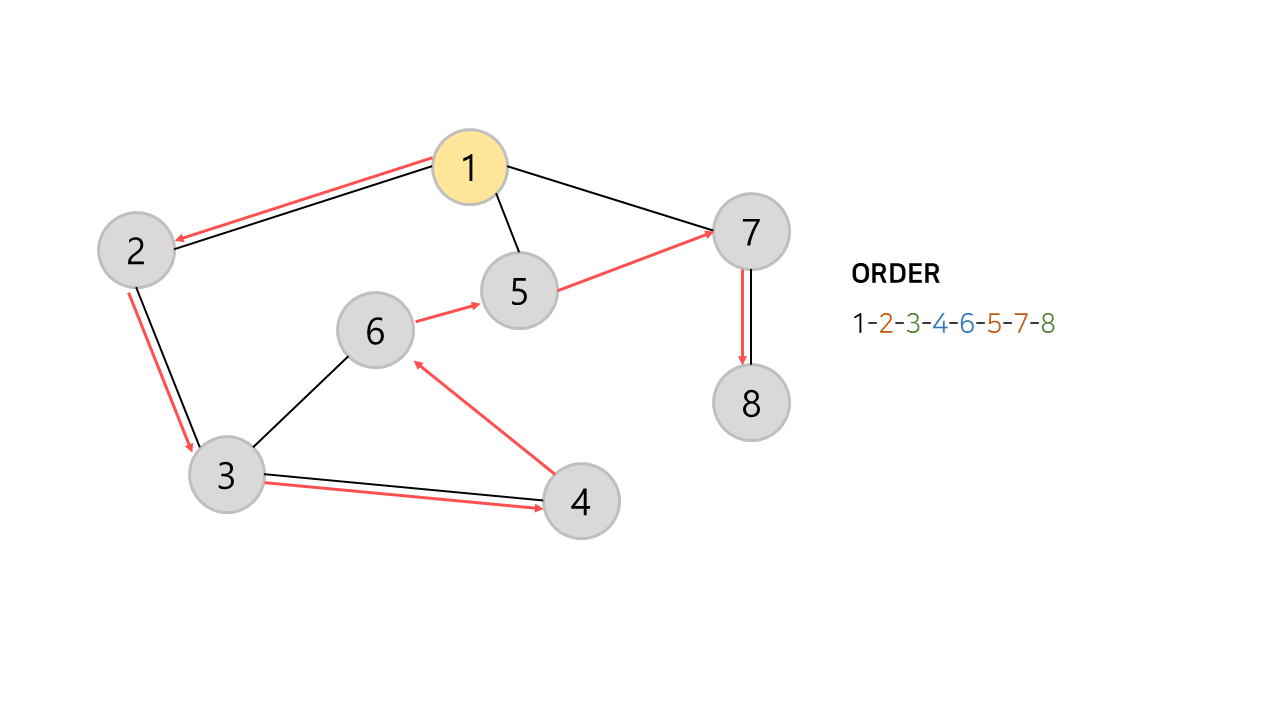 - 2번 노드를 방문한 이후 더 깊이 들어갈 수 있는 노드는 3번 노드가 있다. 그렇기에 다음에 방문하는 노드는 3이다.