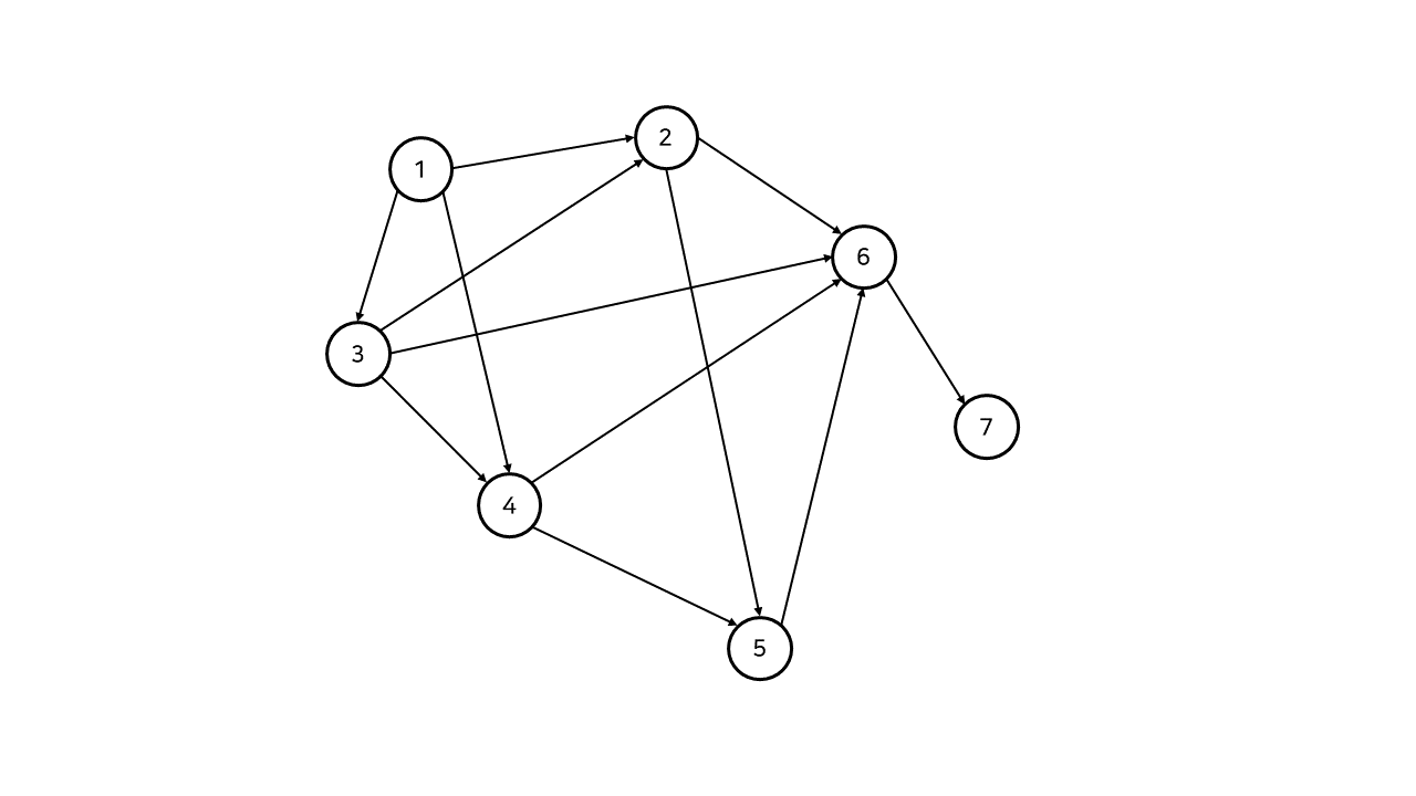다음과 같은 그래프에서 위상 정렬의 동작 원리를 살펴보자.