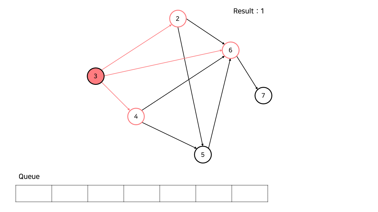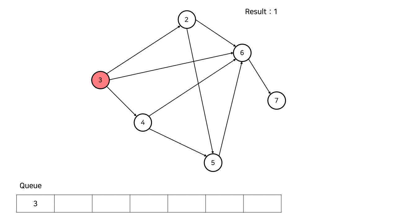 1과 연결된 간선을 없앰으로써 3번 정점의 진입 차수가 0이 되었다. 따라서 큐에 3을 넣는다.