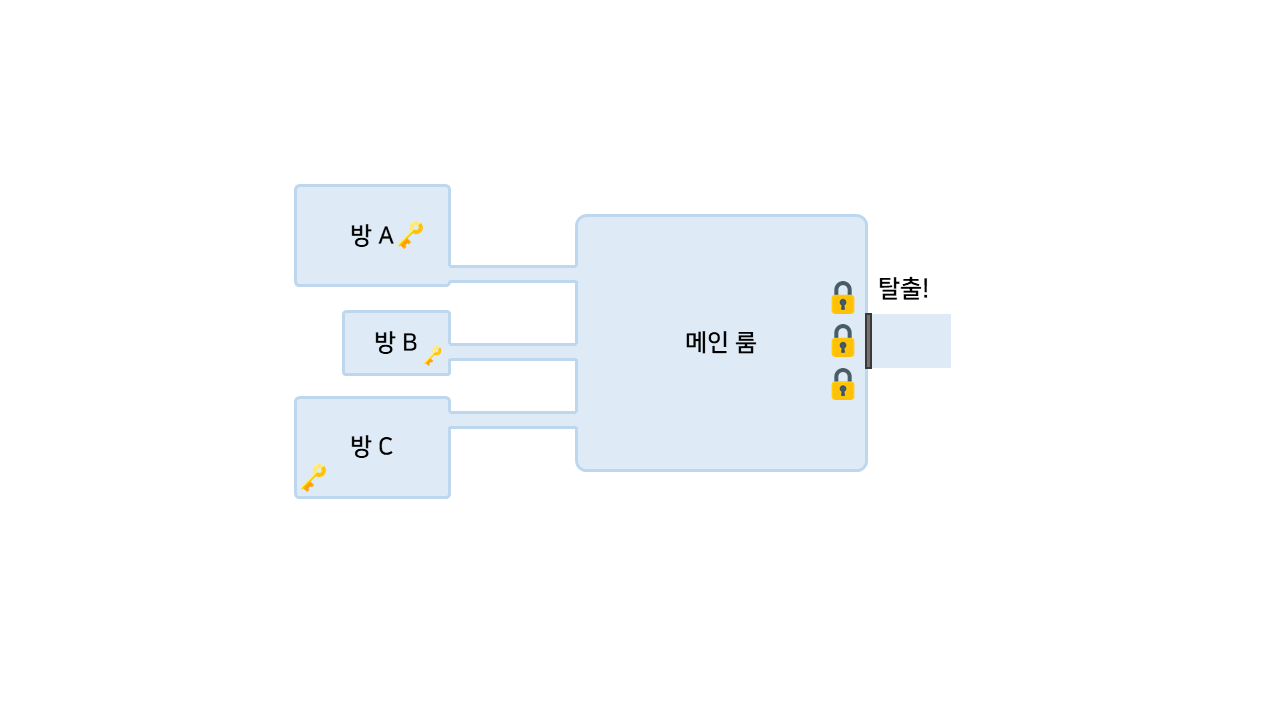 따라서, 메인 룸에서 나가기 위해서는 방 A, B, C 에서 열쇠를 모두 찾아야만 할 것이다. 단 열쇠를 찾는 순서는 영향을 주지 않는다.