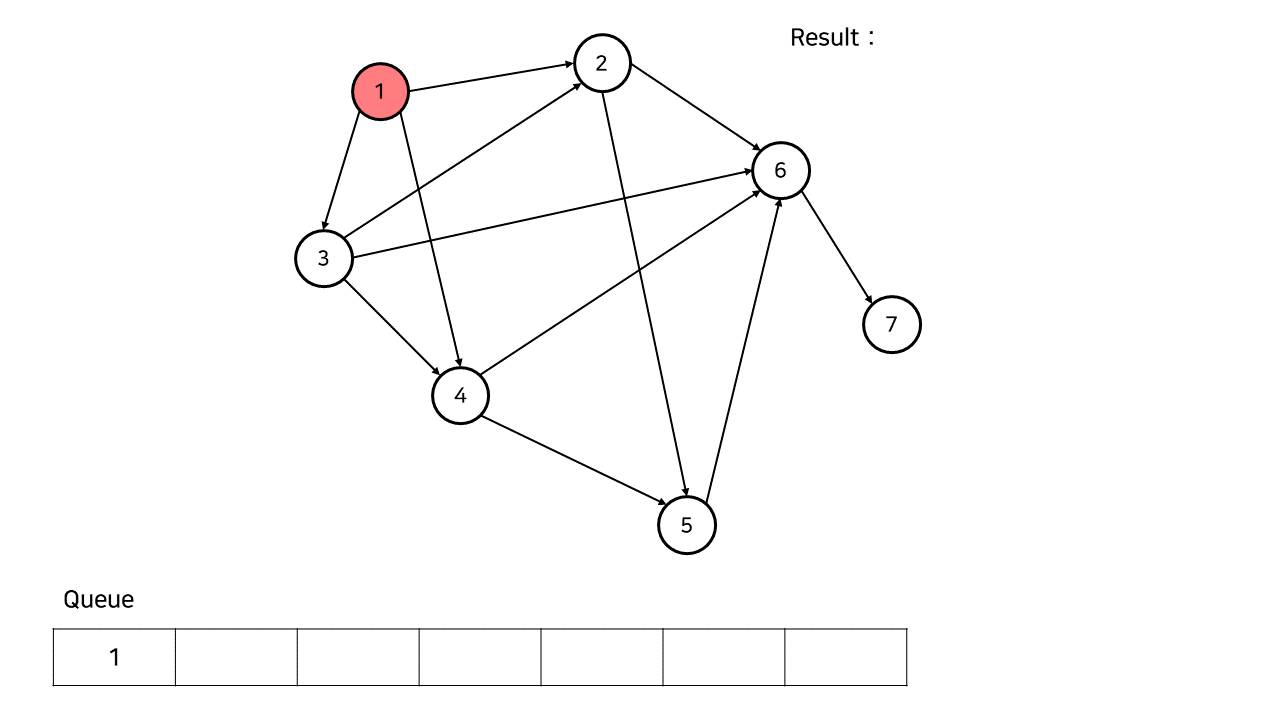 예제 그래프에서 최초 진입 차수가 0인 정점은 1 뿐이다. 따라서 큐에 1을 넣는다.