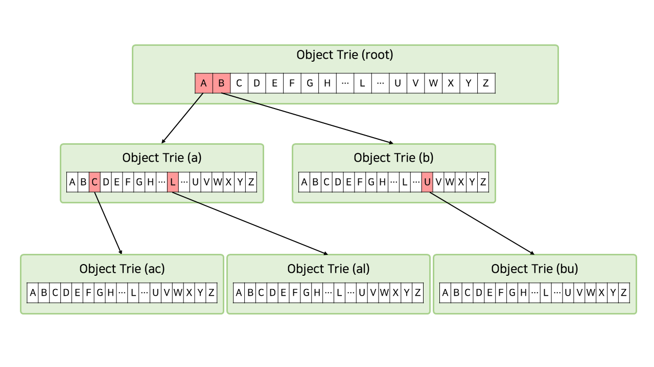 이 포스팅에서는 트라이를 객체지향 형태로 구현한다. 우선, 위에서 설명한 트라이를 구현하기 위해 객체를 구상해보자.