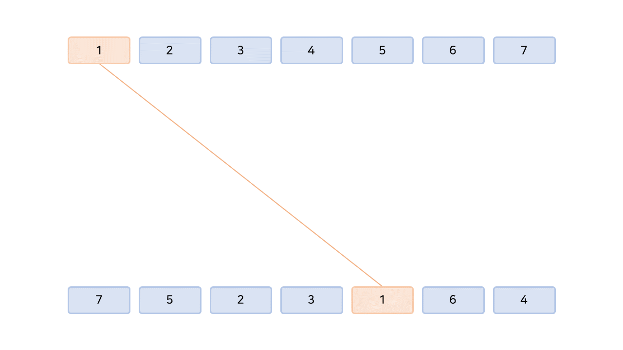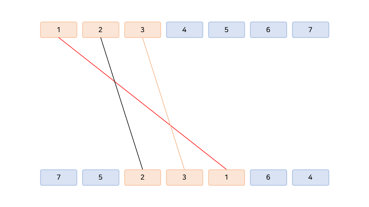 A열의 k번째 기계에 대한 교차점 수는, 연결된 B열의 기계의 뒤 순서에 연결된 A열 1 ~ (k - 1)번째 기계들의 수와 같다.