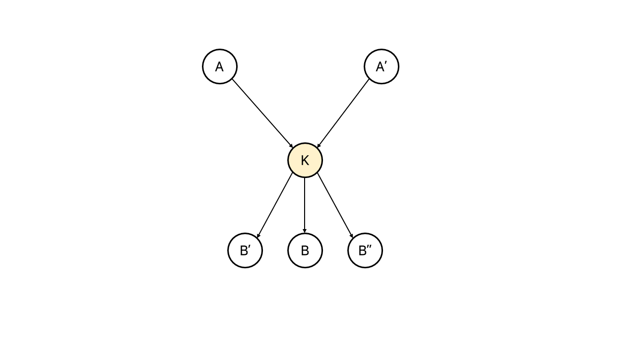 만약 K에서 B ~ F로 각각 나가는 간선이 하나씩 존재하더라도, 이 간선들은 모두 A에서 B ~ F로 나가는 간선으로 대체될 수 있다.